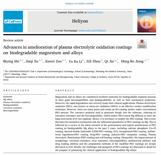 近日,熊猫体育“健谈者”科研社团中的2020级口腔医学专业本科生施碧颖、2021级口腔医学技术专业本科生徐佳琪、2021级口腔医学专业本科生邹家未在熊猫体育姜亨波老师的指导下,以第一作者身份在综合性知名SCI期刊《Heliyon》(影响因子:4.0)上发表科研综述性论文,题目为”Advances in amelioration of plasma electrolytic oxidation coatings on biodegradable magnesium and alloys”