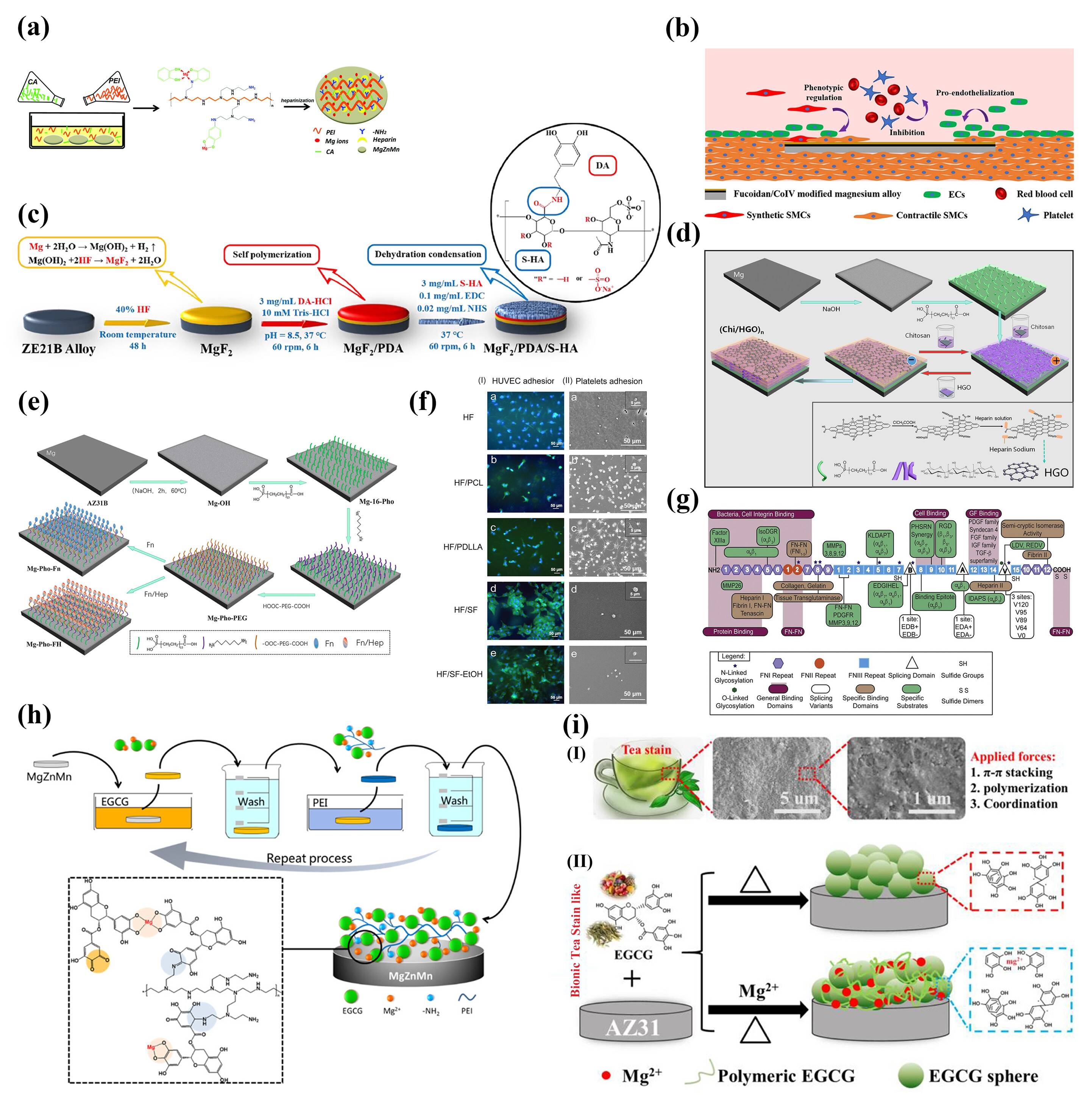 其次,在开发策略上,论文对三大关键方向进行了详尽阐述:合金化策略(Alloying):以 Mg-Zn、Mg-Li、Mg-Al 和 Mg-RE 系列为代表,详细分析了元素配比对降解机制、力学强度及生物性能等的影响,并指出了合金元素可能带来的生物毒性和腐蚀风险,强调了成分优化的复杂性与挑战性。制造与结构优化(Manufacturing and design):围绕激光切割、精密挤压、严重塑性变形技术及结构参数,强调了几何参数与降解性能的平衡问题,同时通过多目标优化和计算模拟提升设计效率。表面改性(Surface modification):论文覆盖了从聚合物涂层(PLA、PLGA、PCL 等)、无机非金属涂层(氟化物、磷酸盐、石墨烯氧化物)、金属氧化物涂层(MgO、TiO₂、ZrO₂)到多功能复合涂层(载药涂层、NO释放涂层等)的广泛研究成果,展示了涂层在延缓降解、提升血液相容性及促进内皮化方面的综合优势。这种涵盖全产业链的分析,体现了作者对BMgS未来设计和临床应用的深刻理解。在结论与展望部分,文章直面BMgS研究的核心瓶颈:缺乏标准化体外评价体系:指出现有测试系统无法完全模拟血流剪切、应力—腐蚀耦合及复杂生物环境的综合作用,呼吁建立动态流动环境下的标准化评价平台。降解与力学性能的矛盾:强调如何在降解速率、支撑强度和血管愈合之间实现平衡,仍是设计优化的关键难题。跨学科融合与个性化需求:强调了“材料科学+工程学+临床医学”三方协同的重要性。