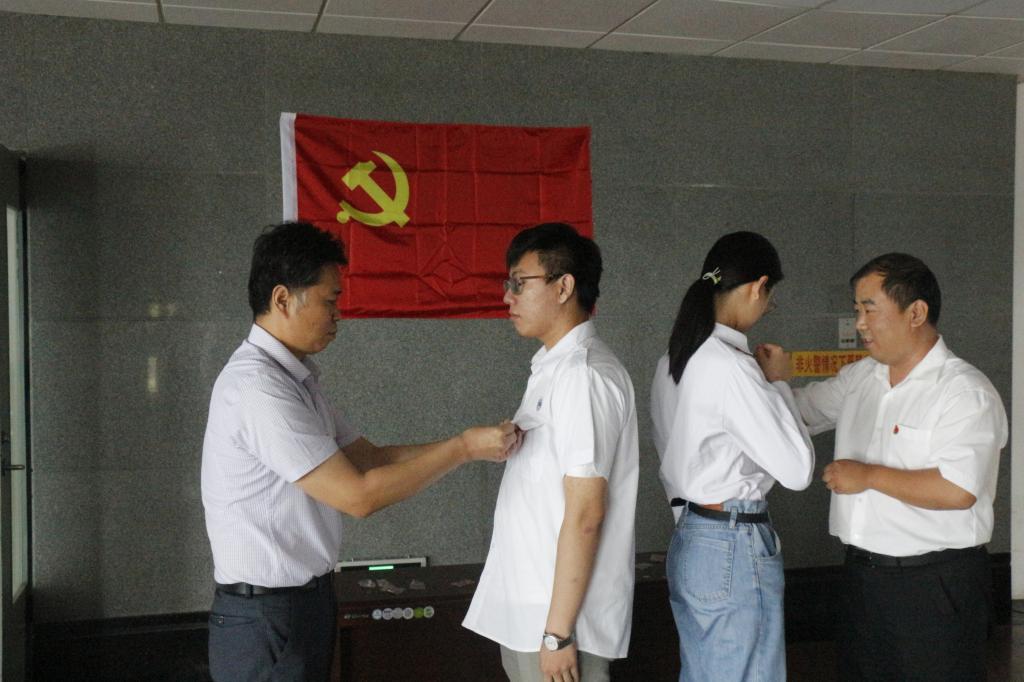 在鲜红的党旗下,党总支书记孔志峰,组织委员、员工党支部书记孙岳鹏为新发展党员逐人佩戴党徽。全体新党员紧握右拳,庄严肃立,面对党旗立下铮铮誓言,表达对党的无限忠诚和为党的事业奋斗终生的决心。新党员教师代表荣洪振、员工代表朱涵进行了表态发言,表达了加入中国共产党的责任感、荣誉感和使命感以及坚定共产主义信念、刻苦学习、努力工作、拼搏进取的信心和决心,郑重承诺用实际行动来践行自己的誓言,完成肩负的职责和使命。