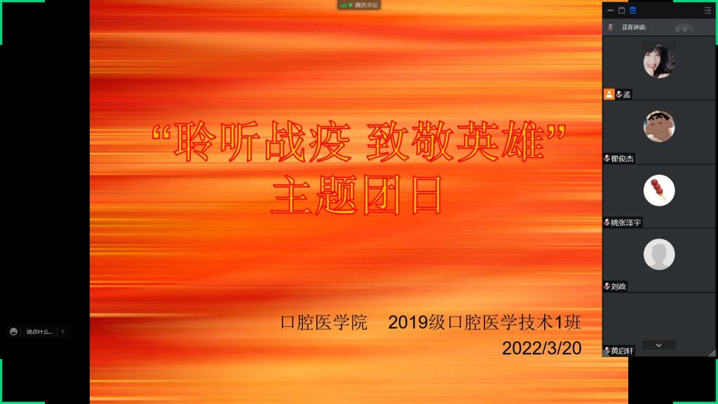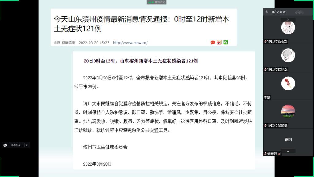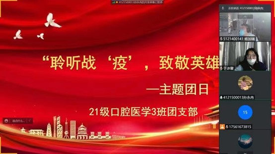 为贯彻落实校(院)疫情防控工作部署要求,切实做好疫情防控工作,让同学们进一步了解抗疫逆行者的感人事迹,增强责任意识与担当意识,2022年3月22日,公司在校年级各班团支部以线上方式开展“聆听战‘疫’,致敬英雄”为主题的团日活动。