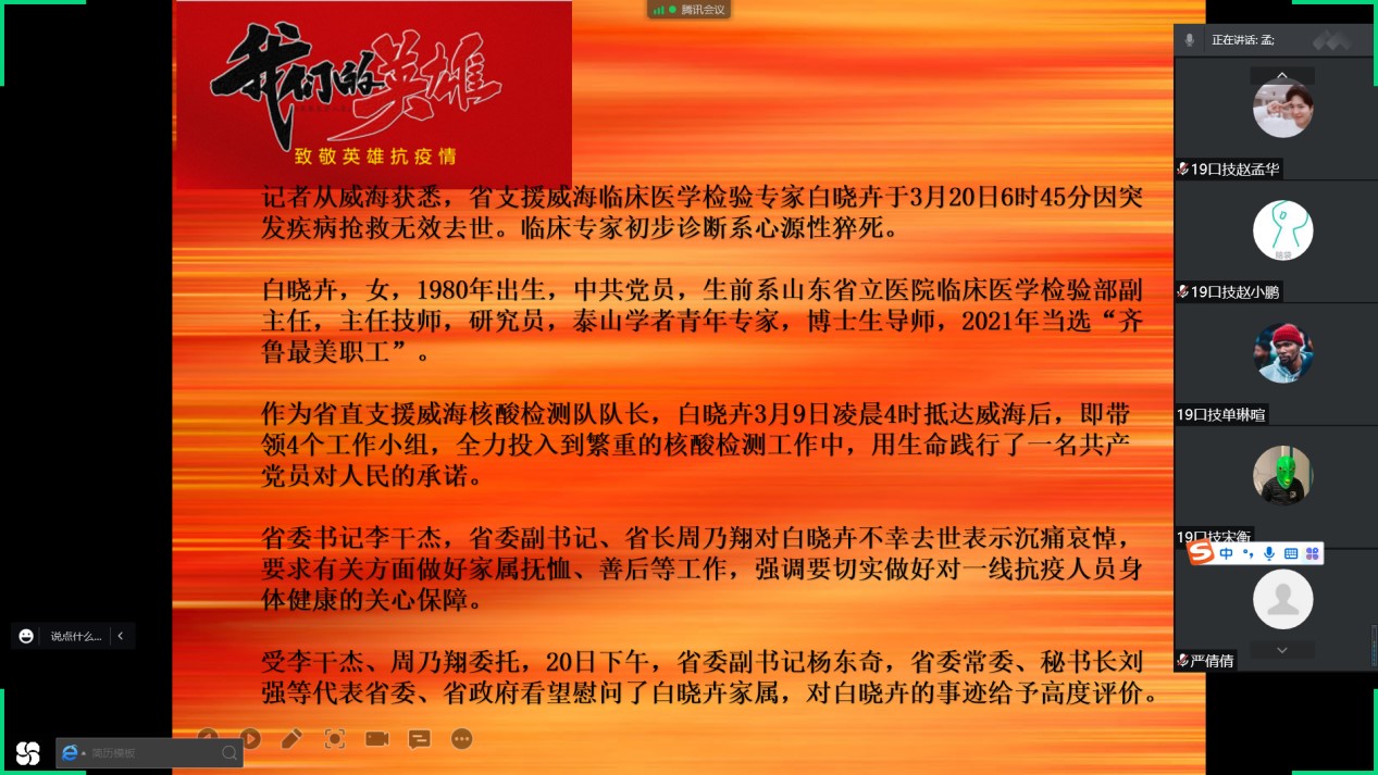 活动主要内容为向在抗击疫情过程中的英雄们致敬。山东省支援威海临床医学检验专家白晓卉在抗疫过程中突发疾病不幸去世,她无畏病毒的威胁,毅然决然带领监测小组奔走于疫情一线,全力投入到了繁重的核酸检测工作中,用生命践行了一名共产党员对人民的庄严承诺。白老师在威海以身殉职,也还有无数的像她一样的医护人员为抗击疫情奉献出了自己的生命;生命重于泰山,疫情就是命令,防控就是责任。在最危急的关头,总有一群奋斗者冲在抗疫的最前线,无数双手挽作长城,挺直国家的脊梁,医务工作者“里三层外三层”日夜坚守岗位、忍受寒冷为居民做核酸;普通群众不计报酬,站岗值班、捐款捐物。时势造英雄,凡人出壮举,他们的战疫故事感人至深。一位英雄就是一个标杆,一群英雄就是一片高原。