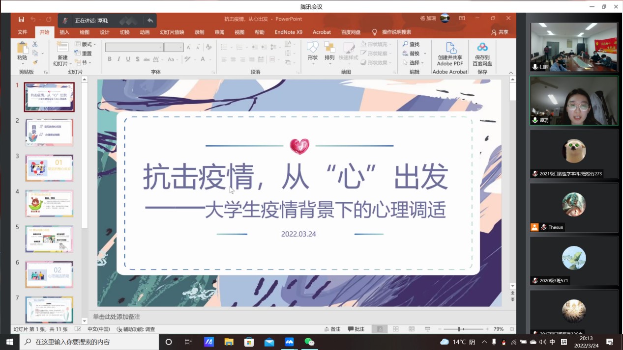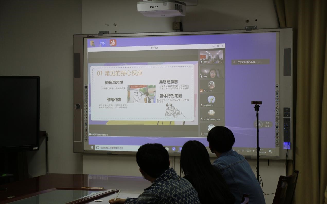 随后,为确保疫情期间同学们的心理健康,辅导员谭玥老师为全体员工进行了“抗击疫情,从心开始”——老员工疫情背景下的心理调适策略主题报告,谭玥老师指出,疫情期间在校老员工往往产生焦虑、担忧、易怒易激惹、情绪低落等身心反应,并分享了情绪调整、保持良好心态的小策略,叮嘱同学们在面临自己解决不了的心理问题时学会向老师、公司心理健康中心求助,希望同学们在遵守疫情防控制度的同时,关爱自己,关注心理健康。