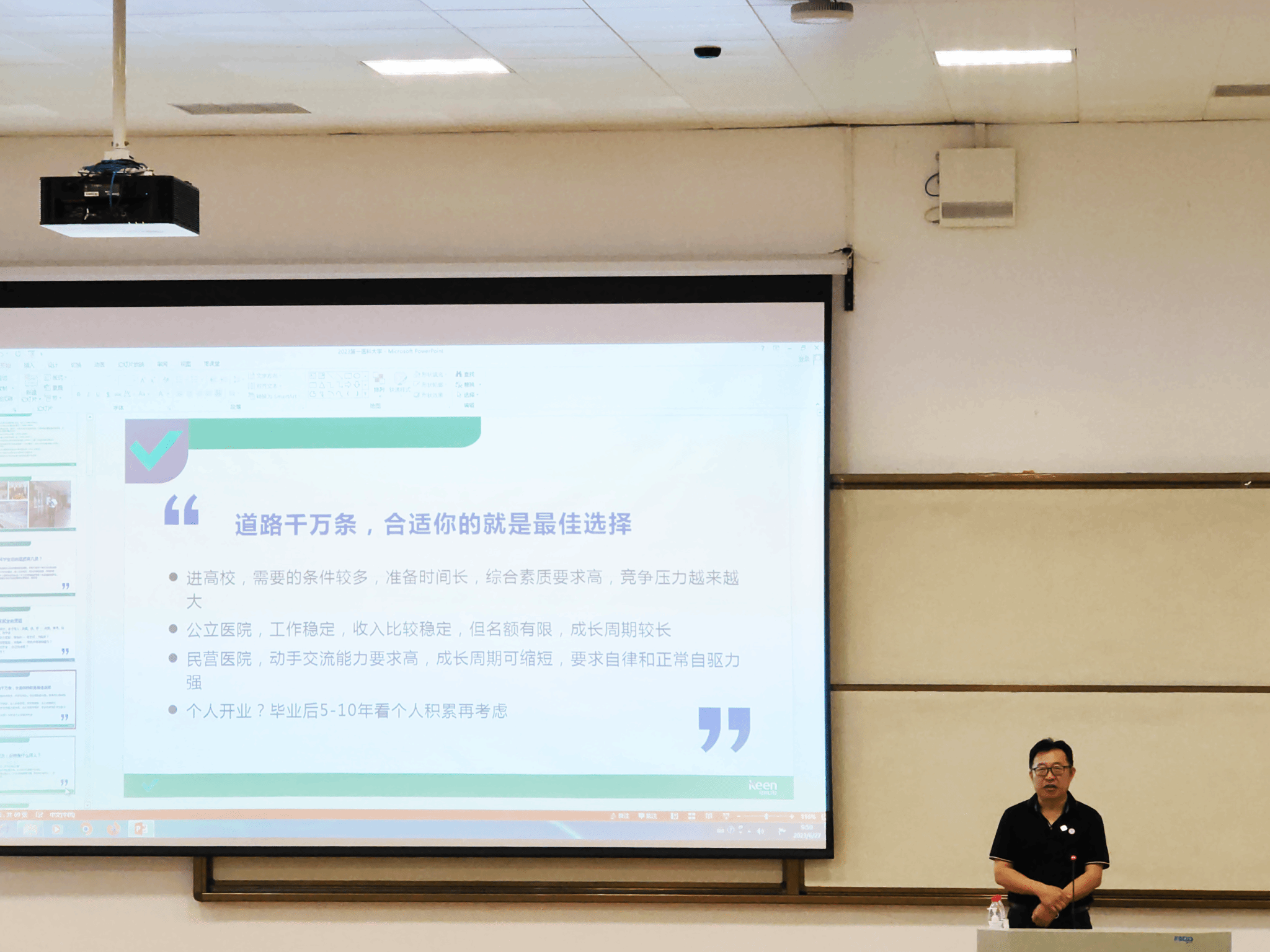 最后,可恩口腔医院总经理亓庆国教授,凭借着自己丰富的专业经验与阅历,围绕口腔专业对人才需求、医生的成长经历及医患沟通等方面进行了系统讲解。正如中国“外科之父”裘法祖院士说的那样:“德不近佛者不可以够为医,才不近仙者不可以够为医。”亓教授语重心长地教导同学们:穿上白大褂并不意味着就成为了医生,医员工的成才之路是一个漫长且艰苦的过程,一日从医,便要坚持在医学领域中奋斗拼搏。