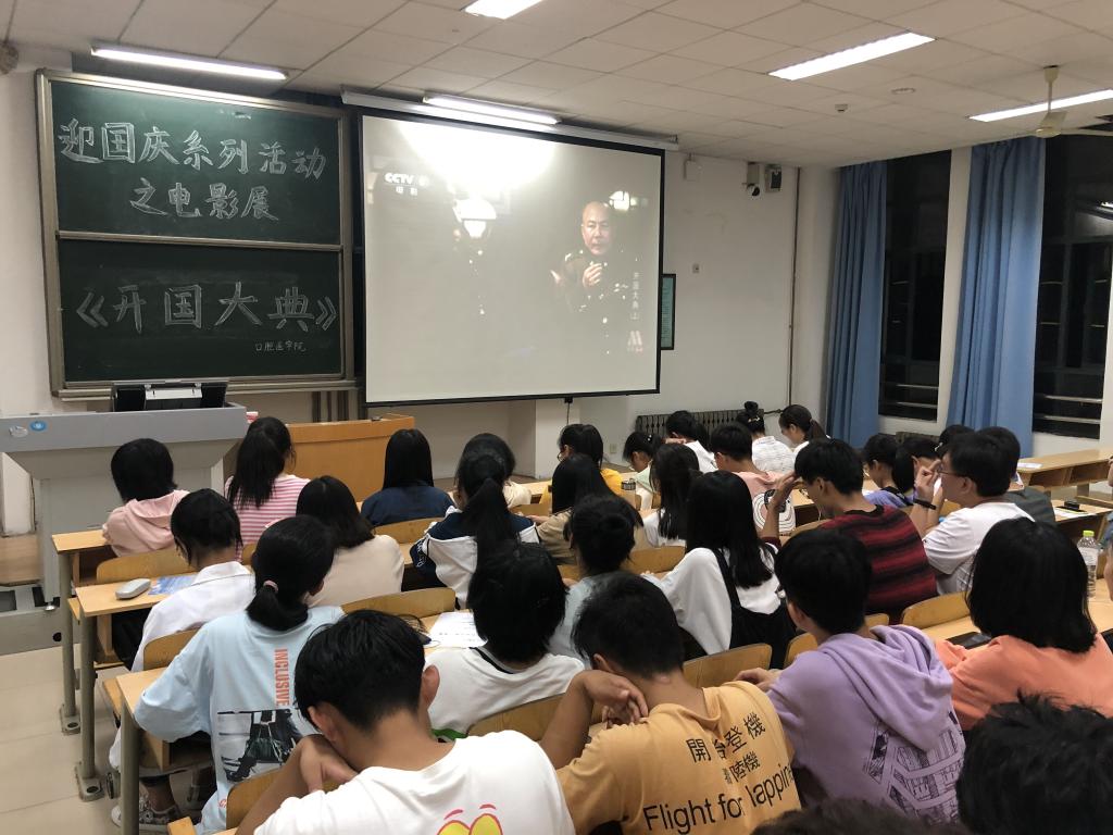 29日晚,同学们在教学南楼C1002一起观看了电影《开国大典》,当看到身穿中山装的毛主席在天安门上宣布“中华人民共和国中央人民政府成立了!”在场的同学们无不满怀激动与感慨,回首过去的70年里的风雨征程与辉煌成就,每一位同学在感慨之余又为自己是一名中国人而深感骄傲。