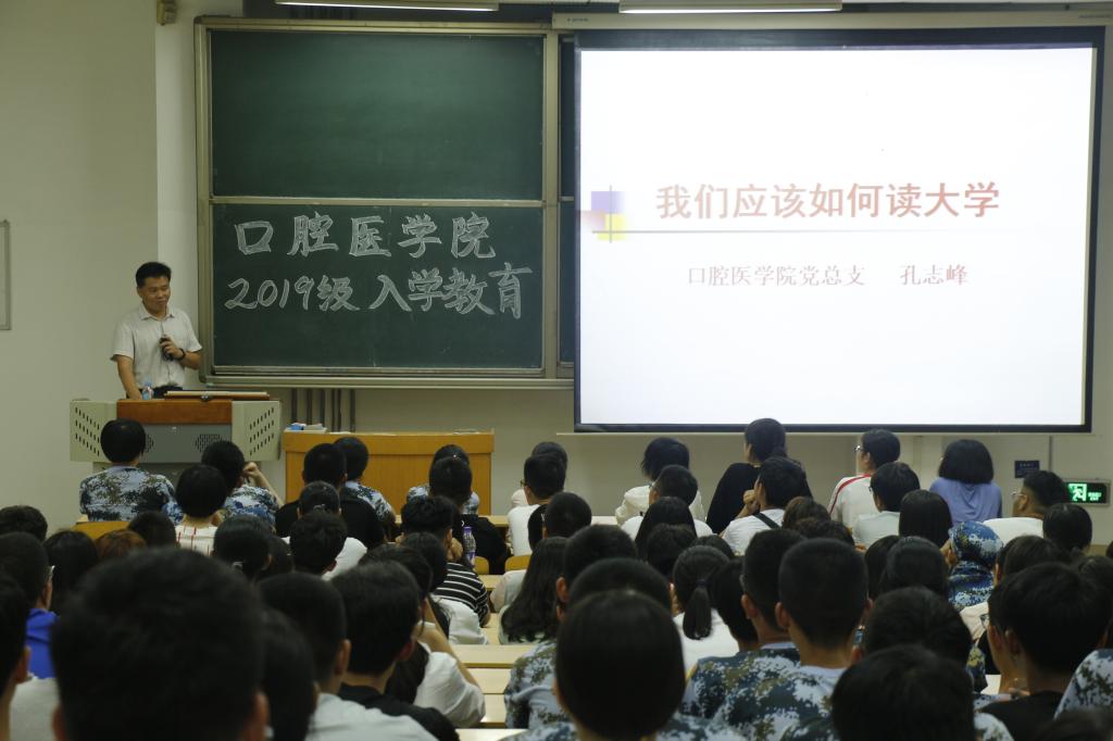 9月2日晚上,分口腔医学和口腔医学技术两个专业进行了专业教育。口腔内科学颌面外科学教研室主任赵作勤教授给口腔医学专业155名员工进行了专业教育,赵教授以病例案列为引导分享自己多年来在教学、临床工作中的心得体会,并从学习兴趣、学习方法等方面和同学们进行交流。他希望同学们珍惜时光、勤奋学习、刻苦钻研、勇于创新,发挥聪明才智,为传承和发展口腔医学事业贡献青春力量。口腔门诊部主任秦德川教授、口腔修复学正畸学教研室副主任韩晓艳、王晓慧为46名口腔医学技术专业同学做了报告,介绍了专业概况、专业课程内容、教学计划和教学大纲,以及团队建设、团队力量、教学设施等基本情况。特别是结合以后的就业去向和行业发展现状给员工的学习进行了指导,使新生对专业有了新的认识和理解,巩固了专业思想,坚定了学习信心,对自己今后的专业学习有了基本的规划。