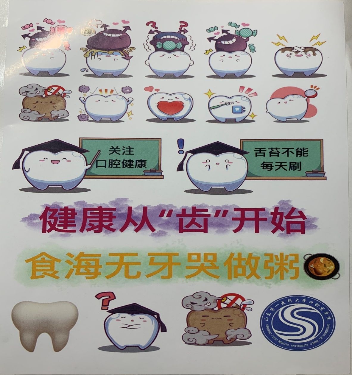 贴画由生动形象的图形和幽默风趣的宣传标语组成,同学们在感受其趣味性的同时也了解了更多的口腔健康知识,从而提高了同学们保护口腔健康的意识。