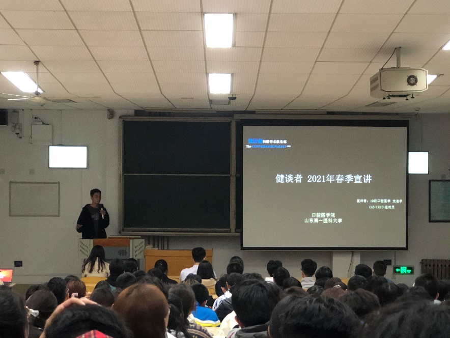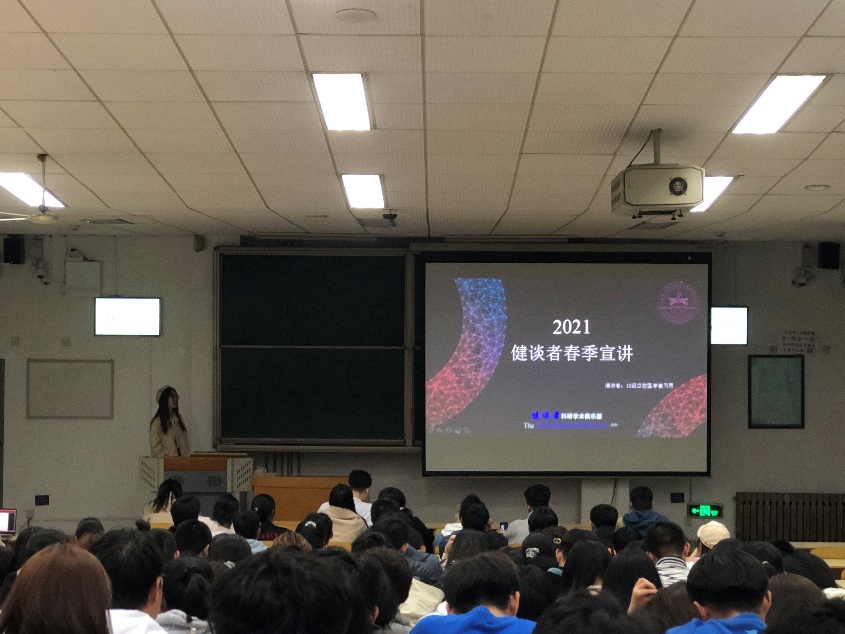 宣讲伊始,19级史浩宇为大家展示了“健谈者”员工参加2021年挑战杯的短片,介绍了“健谈者”的起源和历史,以及“健谈者”创立以来在论文发表和科研创新方面取得的成绩。最后他欢迎20级学弟学妹们参与到这样一个把创意变成现实的学术科研交流平台。接下来,18级崔乃雨分享了自己参加“健谈者”以来的心得。她提到作为一名“健谈者”,很多时候是在用别人休息的时间做研究,累并充实着。她鼓励同学们加入到平台中来,和一群志同道合的人一起,在大学中做一些有意义的事情。