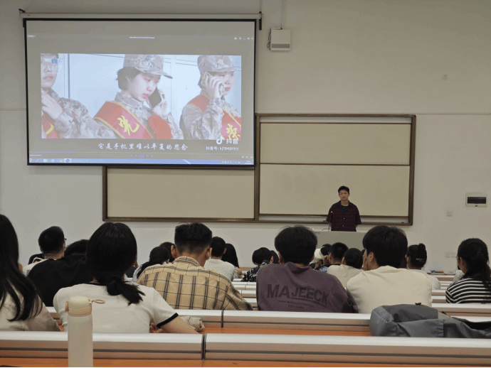 田菁同学围绕部队基本情况、参军流程、优惠政策、部队发展前途四个方面,向我们展示了丰富的军旅生活和当前军队政策。通过田菁同学的介绍,同学们更加清楚地了解了参军入伍的各项优势,激发了同学们的参军热情。