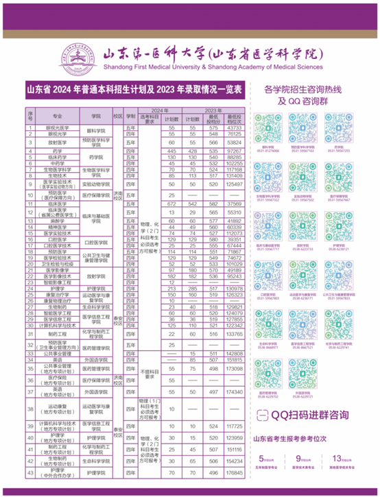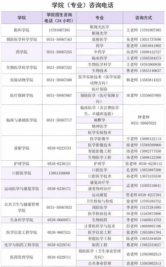 1、新增招生专业及方向;康复物理治疗、智能影像工程两个专业,计划各30人。预防医学(卫生事业管理方向)和预防医学(医疗保障方向)两个专业方向,在泰安校区医药管理公司、济南校区医疗保障公司分别招生,计划各40人,学制五年。